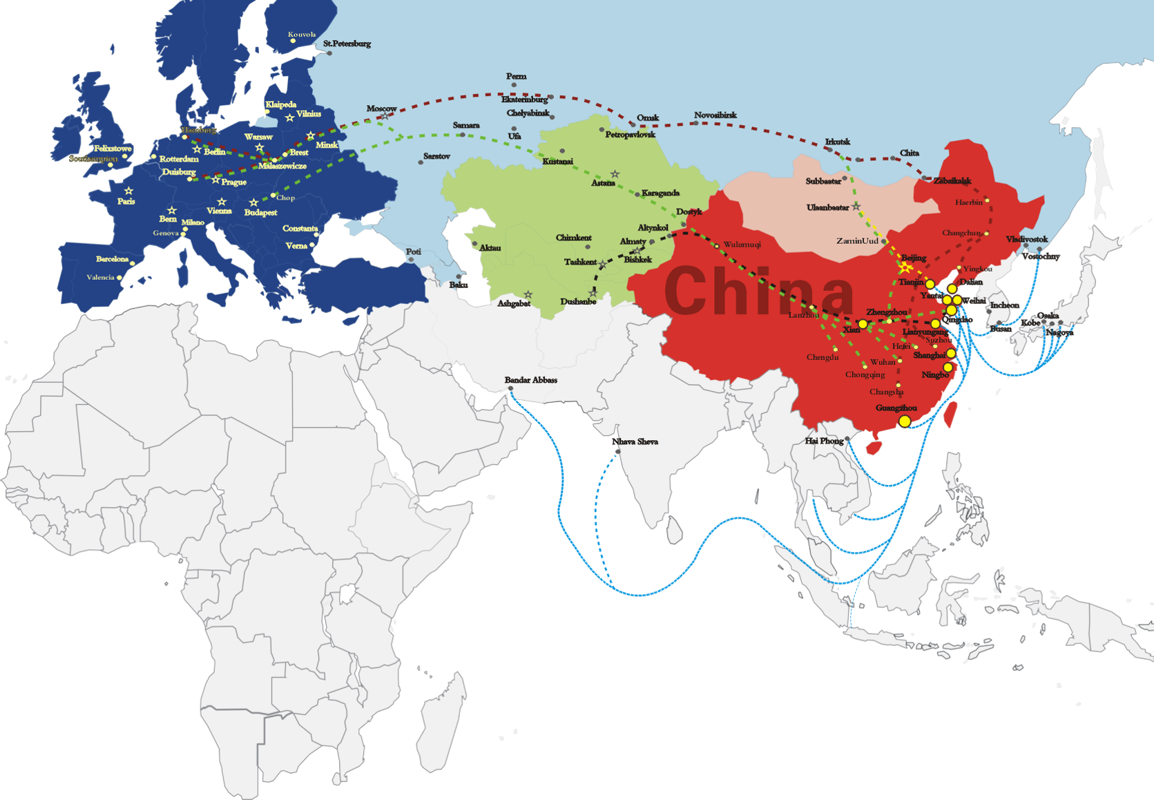 TCR路线 海运至青岛、连云港,经换装由铁路运输通过阿拉山口/霍尔果斯口岸、二连浩特口岸、满洲里口岸运往中亚五国、蒙古等国的集装箱及其它货物运输或反向运输;