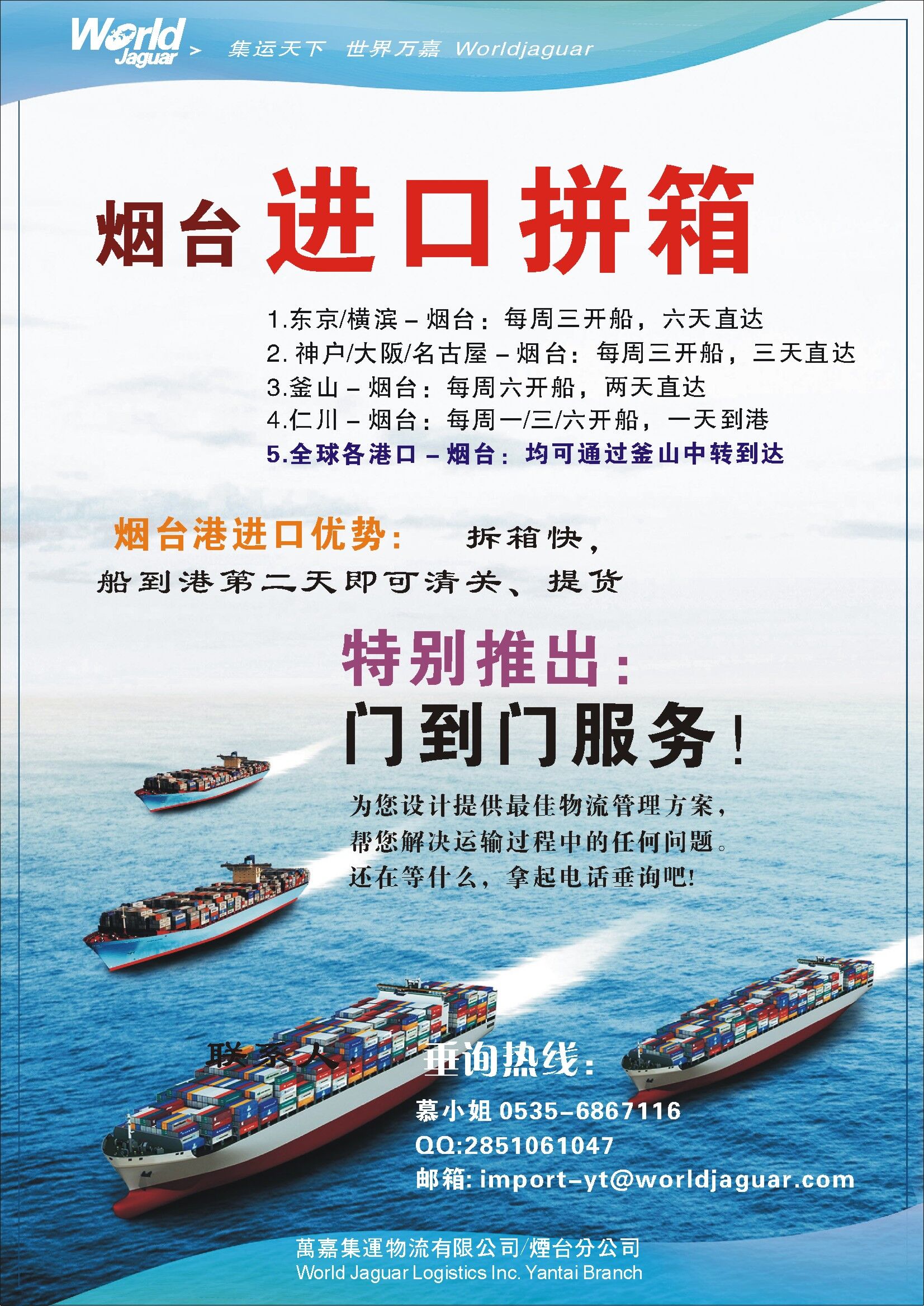 横滨-烟台 YOKOHAMA 周三 6天 4.30 顾婷婷
